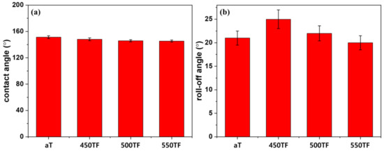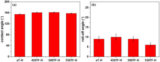 Superhydrophobic self-cleaning properties of the photocatalyst-treated PET fabrics; (a) contact angle and (b) roll-off angle.