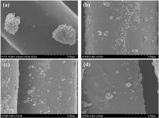 TMorphologies of the prepared photocatalyst/HDS-treated PET fabrics; (a) aT-H; (b) 450TF-H, (c) 500TF-H, and (d) 550TF-H.