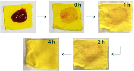 In the real textile industry, the textile finishing process follows the dying of fabrics. Therefore, the photocatalyst treatment and hydrophobization of dyed PET fabric were carried out as described in Section 2.3 and Section 2.4. The standard white PET fabric was dyed with C.I. disperse yellow 54 (LG Chemicals, Seoul, Korea) using 1% o.w.f. water solution with a liquor ratio of 1:40. Tomato ketchup was dropped on the dyed and treated fabric and left for 30 min. Then, the ketchup was wiped off the fabric surface and the contaminated fabric was exposed to sunlight for 0, 1, 2, and 4 h.