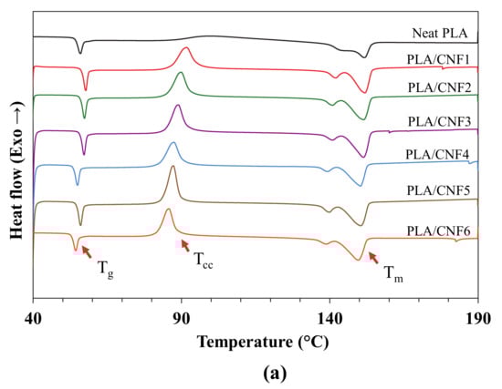 Furthermore, a second exothermic peak observed in Figure 1c corresponds to the peak of cold crystallization temperature, Tcc. A very clear cold crystallization peak was observed for neat PLA in the subsequent heating phase, which demonstrated that this material had undergone a slow crystallization process as it was unable to crystallize properly during cooling. On the other hand, the cold crystallization peak of the samples shifted to lower temperatures and exhibited lower cold crystallization enthalpy with the presence of CNF in the PLA matrix. Reinforcing PLA with low composition of CNF (1–3 wt.%) resulted in smaller cold crystallization peaks, in which the peak for 3 wt.% CNF-reinforced nanocomposite was almost unseen. This indicated that the complete crystallization process occurred during the cooling process, mainly due to the CNF nucleation effect. In contrast, a clear cold crystallization peak for PLA reinforced with 4–6 wt.% CNF was seen to indicate some incomplete crystallization process during cooling. This finding is in agreement with the previous studies related to the CNF nucleation effect on the thermal properties of PLA and PLA reinforced with natural fiber [31,32,33,34,35].