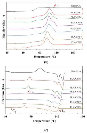 DSC curves at 2 °C/min for neat PLA and PLA/CNF nanocomposites: (a) first heating scan, (b) cooling scan, and (c) subsequent heating scan.