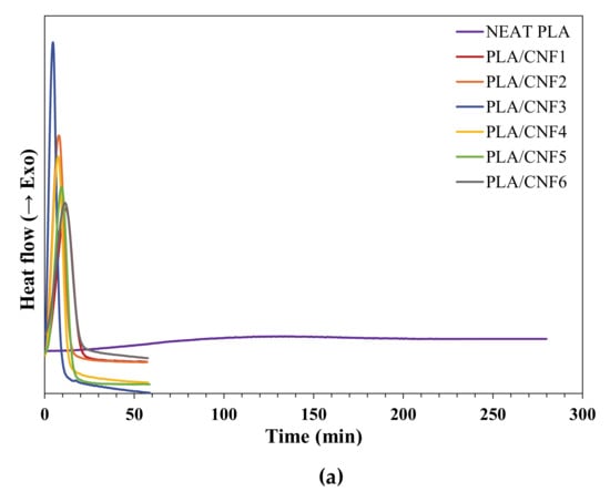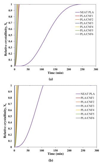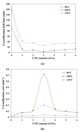 Besides that, the crystallization rate of PLA-reinforced CNF nanocomposites was higher than that of the neat PLA, as illustrated in Figure 5b. This finding confirms that the presence of CNF accelerates the isothermal melt crystallization of PLA. The highest crystallization rate of 0.716 min−1 was achieved when 3 wt.% of CNF was reinforced into the PLA matrix and isothermally melt crystallized at Tc = 100 °C. This was 65 fold higher than the neat PLA.