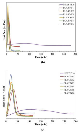 Isothermal crystallization isotherms of neat PLA and PLA/CNF nanocomposites at (a) 90, (b) 100 and (c) 110 °C.