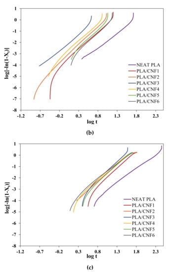 Avrami plots of neat PLA and PLA/CNF nanocomposites isothermally crystallized at (a) 90, (b) 100, and (c) 110 °C.