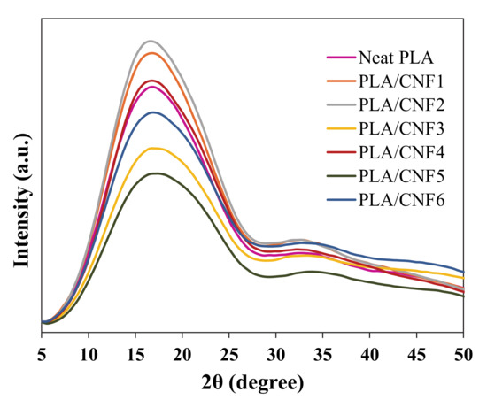 XRD diffraction patterns of neat PLA and PLA/CNF nanocomposites.