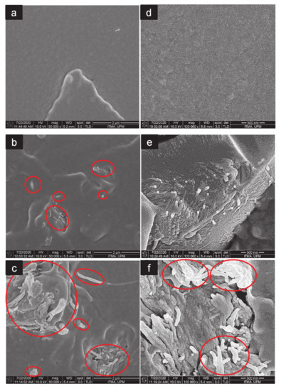 The FESEM micrographs of the nanocomposites fractured surfaces, i.e., neat PLA (Figure 7a,d), PLA/CNF3 (Figure 7b,e), and PLA/CNF6 (Figure 7c,f) are shown, respectively.
