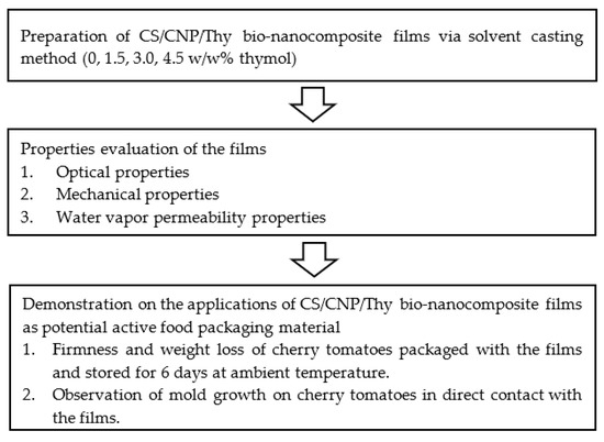 CS/CNP/Thy bio-nanocomposite films were successfully developed, characterized, and demonstrated as potential active food packaging material. It was found that the changes in opacity and color properties of the films with the addition of thymol were only minimal and almost non-noticeable. The addition of thymol to the films reduced the mechanical properties (TS, EAB, and YM) of the films due to the plasticizing effect of thymol, but the increment of concentrations of thymol did not significantly affect the mechanical properties due to the low concentrations of thymol (≤4.5w/w%). It was also found that the addition of 1.5w/w% thymol to CS/CNP bio-nanocomposite films increased the WVP but the WVP decreased with the increment of thymol concentrations due to the hydrophobic nature of thymol which disrupted the hydrophilic/hydrophobic balance of the film and its ability to limit the water vapor penetration through the film. In addition, the CS/CNP/Thy 3% bio-nanocomposite films were efficient in maintaining the firmness and reducing the weight loss of cherry tomatoes compared to neat CS films and CS/CNP bio-nanocomposite films during 6 days of storage. The CS/CNP/Thy 3% bio-nanocomposite films also demonstrated the potential to lengthen the shelf life of cherry tomatoes by inhibiting the mold growth on cherry tomatoes during 7 days of storage. The potential of the CS/CNP/Thy bio-nanocomposite films as active food packaging material shall be further explored and further work shall be conducted on the structure and morphology; thermal; and antimicrobial properties of the films.