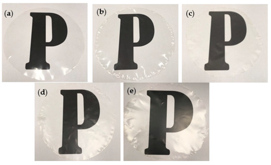 Appearance of the films on alphabet of “P”; (a) neat CS film; (b) CS/CNP; (c) CS/CNP/Thy 1.5%; (d) CS/CNP/Thy 3%; (e) CS/CNP/Thy 4.5% bio-nanocomposite films.