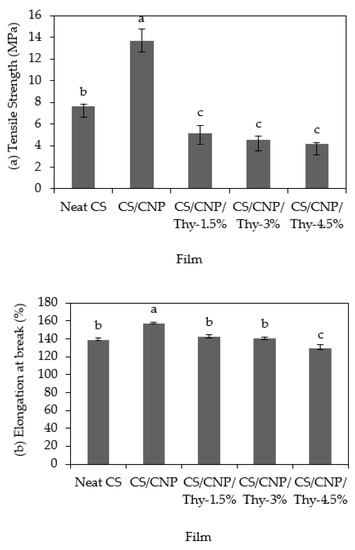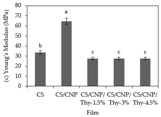 (a) Tensile strength (TS); (b) elongation at break (EAB); (c) Young’s modulus (YM) of the neat CS film, CS/CNP, and CS/CNP/Thy bio-nanocomposite films incorporated with different concentrations of thymol. Different letters in the same graph indicate a statistically significant difference (p < 0.05).