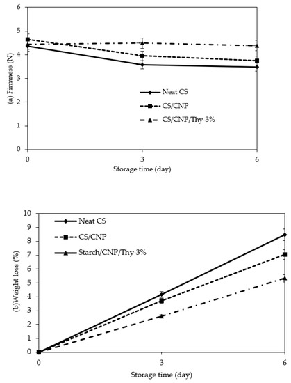 (a) Firmness and (b) percentage weight loss of cherry tomatoes packaged with neat CS films, CS/CNP bio-nanocomposite films, and CS/CNP/Thy 3% bio-nanocomposite films during 6 days’ storage at ambient condition.