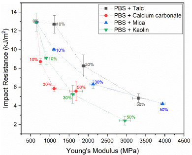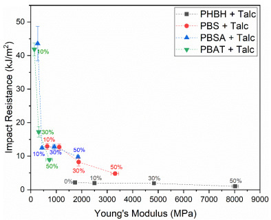Relation between the Young’s modulus and notched impact resistance of talc-filled PBS, PBSA, PHBH, and PBAT composites.