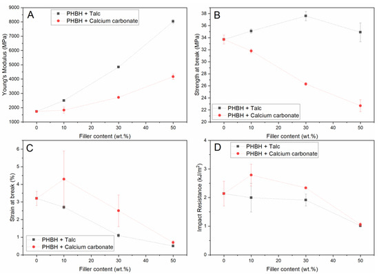 Mechanical properties (Young’s Modulus (A), strength at break (B), strain at break (C), and notched impact resistance (D)) of talc and calcium carbonate in PHBH.