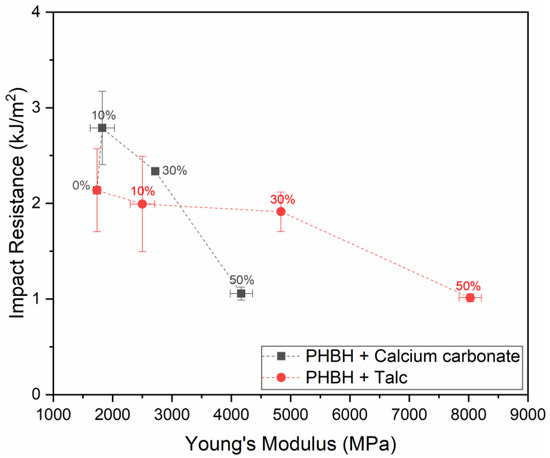 Figure 3A shows that the modulus of PHBH is gradually increased upon the addition of both talc and calcium carbonate up to a modulus around 8000 MPa for a 50 wt.% talc-filled compound. These results are in accordance with the trends observed in Figure 1A. The effect of the selected fillers on the strength, depicted in Figure 3B, does show a different trend than observed for PBS in Figure 1B. Here, a moderate increase in strength is observed for talc-filled PHBH, while a reduction in strength was observed for PBS-based materials. At the same time, a clear reduction in strength is visible when the polymer is loaded with calcium carbonate which is in line with results obtained in PBS. Figure 3C shows that unfilled polymer is significantly less tough than PBS and non-biodegradable polymers such as PP and that the addition of high quantities of filler material promotes this behavior up to a level where the strain at break is lower than 1%. Figure 3D shows that an increased filler content has a less detrimental effect on the impact resistance than it has on the strain at break. A small increase in impact resistance can even be observed for the lower concentrations of calcium carbonate used in this study. This is also reflected in the graphical comparison between the notched impact resistance and Young’s modulus of the PHBH composites that are depicted in Figure 4.