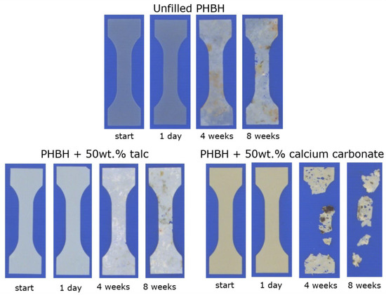 The polymers investigated in this study all show biodegradation rates in soil that are substantially higher than those of conventional non-biodegradable polyolefins (e.g., PE/PP) and polyesters (e.g., PET). This material property gives these polymers an additional end-of-life scenario that can come into effect when products made from these materials intentionally or unintentionally end up in the natural environment. However, as it shown in this study that the use of mineral fillers can be used to direct their mechanical properties towards those of industrially applied plastics, it is crucial to identify whether these additives do not negate their unique biodegrading features. The full characterization of polymer composite biodegradability requires monitoring of the actual demineralization process into water and carbon dioxide, which is beyond the scope of this study. Nevertheless, a soil disintegration test was performed to identify the effect of both calcium carbonate and talc on the soil biodegradation of PHBH. The visual disintegration of three PHBH compounds upon soil exposure in a timeframe of 8 weeks is depicted in Figure 7. This figure shows that unfilled PHBH shows local patches of discoloration that are attributed to microbial activity within the first 4 weeks of the experiment, although no apparent loss of material is visible at this point of measurement. This discoloration is not simply attributed to the handling and soil staining of the test samples as the specimens that were exposed for only 1 day do not show this effect. Upon soil exposure of 8 weeks, these specimens start to show the first signs of visible disintegration, which is reflected by the presence of visible defects in the polymer sheet which are also attributed to microbial digestion.