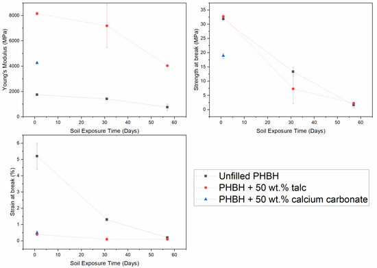 Aside from the visual observations in Figure 7, the recovered test specimens were subjected to a tensile test in order to assess the decay of the modulus, strength at break, and strain at break over time. These results are shown in Figure 8. Here, it is shown that all mechanical properties of the unfilled PHBH specimens are gradually lowered as the soil exposure time is increased, which corresponds with the visual observations of Figure 7.