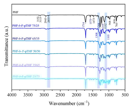 Fourier Transform Infrared (FTIR) spectra of PHF homopolymer and PHF-b-F-pTHF copolymers.
