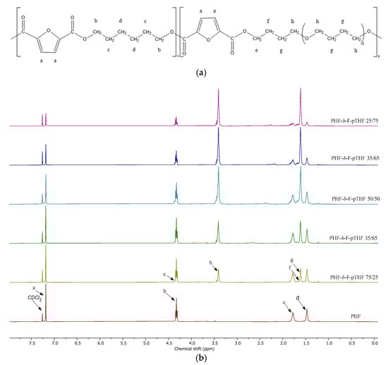 The chemical structure of PHF-b-F-pTHF poly(ether-ester)s was further assessed by quantitative 1H NMR studies. The chemical shifts and corresponding peak assignments are reported in Figure 3. In the 1H NMR spectra of homopolymer, the resonance corresponding to the two furanoate ring protons appear as a singlet signal at 7.09 ppm (a signal), whilst those corresponding to the outer (b signals), inner (c signals), and middle (d signals) methylene protons of hexylene glycol units occur at 4.23 ppm, 1.63 ppm, and 1.31 ppm, respectively. These peak assignments agree well with the data reported earlier by Jiang et al. [29] and Papageorgiou et al. [21]. All of the resonances mentioned above can also be distinguished in the copolymer spectra, with their intensity being dependent on the ratio of FHD to F-pTHF segments. Besides, a number of new resonance signals attributable to the protons of pTHF blocks occur at copolymers spectra. New peaks occurring at 1.60 ppm (h signal) and 3.40 ppm (g signal) can be reasonably ascribed to outer and inner methylene protons of pTHF ether blocks, respectively [50]. Furthermore, new less intense signals occurred in the methylene group proton region owing to pTHF protons located in a different environment (adjacent to PHF segment by ester bond) after transesterification reaction between the various units, i.e., PHF and pTHF. The methylene proton resonances of pTHF segments attached to PHF can be observed at 4.36 ppm (e signal, partially overlapped with b signal) and at 1.64–1.71 ppm (f signal). It is clear that the intensity of both pTHF main chain peaks (g and h signals) and cross-peaks (e and f signals) depends on the content of ether co-units and increases sharply as the ratio of pTHF increases.