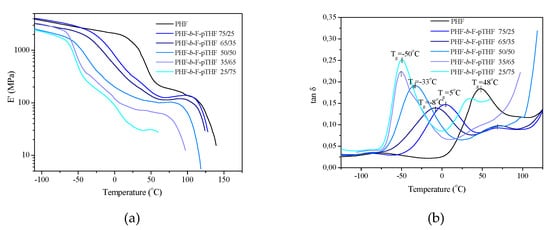 The storage modulus E’ (a) and tan δ (b) as a function of temperature for PHF-b-F-pTHF copolymers.