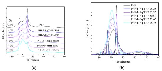 X-ray diffraction (XRD) curves of PHF-b-F-pTHF copolymers (a) with separated crystalline peak positions and amorphous halo reflections (b).