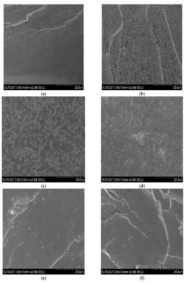 Observations carried out by scanning electron microscopy (SEM), significant from the point of view of the material structure analysis, confirmed the heterogeneity of the structure of the PHF-b-F-pTHF copolymers tested. Although both phases are immiscible, they exert a significant influence on each other. The micrographs of the fractures of the samples are presented in Figure 7. The obtained images showed differences in the phase structure depending on the composition of the copolymers. Figure 7a shows the spherulitic morphologies of the PHF. With the increase in the proportion of pTHF in the copolymer, spherulites became larger, but their number decreased (Figure 7b–f), which was confirmed by the DSC research. Based on the shape and temperature position of the crystallization peaks on the DSC curves determined during the cooling of the molten polymer with a constant speed (Figure 4a), it can be seen that the crystallization rate influenced the crystallite morphology. The crystallization peaks of PHF-b-F-pTHF 75/25 and PHF-b-F-pTHF 65/35 samples were characterized by a wide base (wide temperature range), which means that at this cooling rate, crystallization took place more slowly than for others. This was manifested by more crystalline forms with a more regular shape. Faster crystallization favors irregular forms.