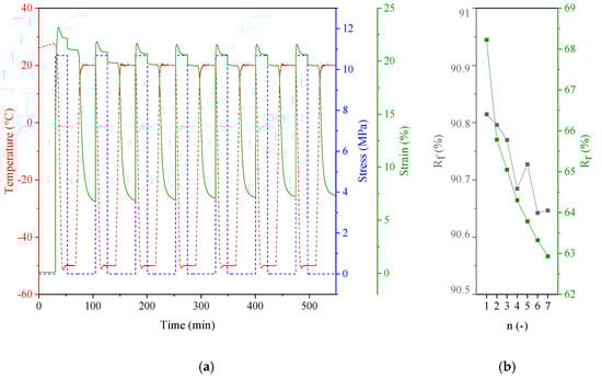 Shape memory properties of PHF-b-F-pTHF 25/75: (a) multiple thermomechanical cycles and (b) shape fixity (Rf) and shape recovery efficiency (Rr) vs. cycle number.