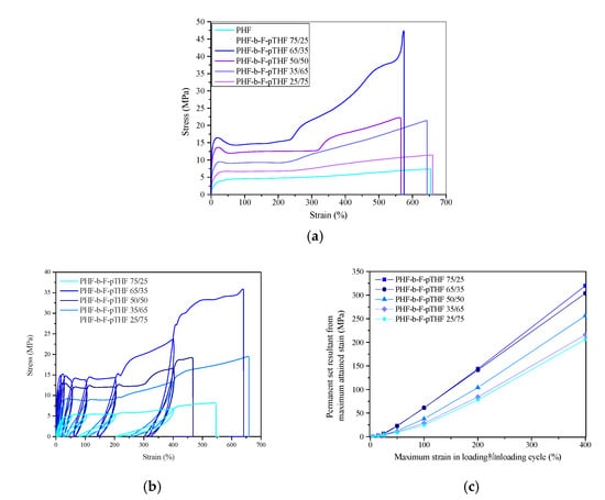 Representative stress–strain curves for PHF-b-F-pTHF copolymers from (a) static tensile tests, (b) cyclic tensile tests, and (c) permanent set results after following deformation cycle.