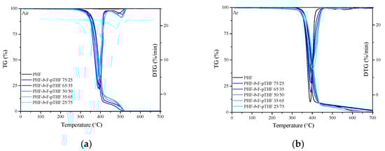 Mass loss (TG) and derivative of mass loss (DTG) curves for PHF-b-F-pTHF copolymers measured in an oxidizing atmosphere (air) (a) and in an inert atmosphere (argon) (b) at the heating rate 10 °C/min.
