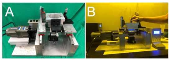 Roller embossing experiments were conducted on a lab-made UV roller embossing device [3]. The device consists of a UV light source, a soft mold roller stamp that has a diameter of 50 mm, a movable table actuated via a speed-adjustable step motor, and a container that accommodates the UV-curable polymeric solutions (Figure 2). The utmost power of the UV light (BWL-100, ByWell Materials Co, New Taipei City, Taiwan) is 3900 mW/cm2 with a wavelength of 365 nm. Two levels of UV radiation, 530 and 3900 mW/cm2, were employed, while three shifting speeds of the table, 5.2, 13.1, and 20.9 mm/s, were adopted.
