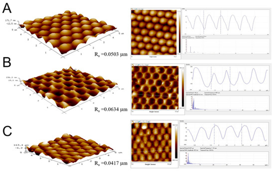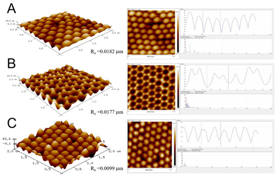 Atomic force microscopy (AFM) surface profiles of (A) an assembled 300 nm nanosphere array, (B) a replicated soft mold, and (C) an embossed nanofeatured film.