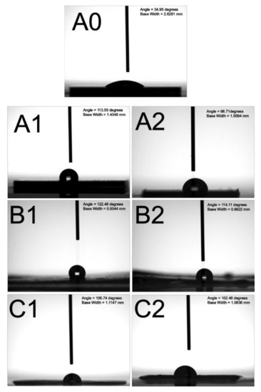 Water contact angles of (A0) silicon substrate—34.95°, (A1) assembled 300 nm nanosphere array—113.55°, (A2) assembled 900 nm nanosphere array—78.56°, (B1) replicated 300 nm soft mold—122.46°, (B2) replicated 900 nm soft mold—114.11°, (C1) embossed 300 nm featured film—106.74°, (C2) embossed 900 nm featured film—102.46°.
