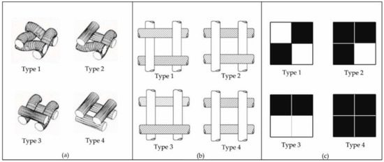 Four types of pores in woven fabrics, shown: three-dimensionally (a), planar (b), and on woven paper (c) [19,21].