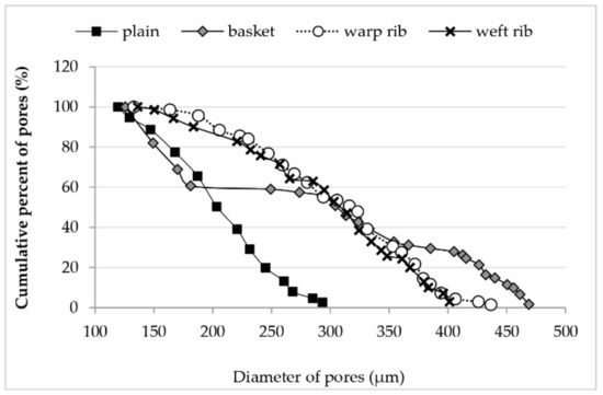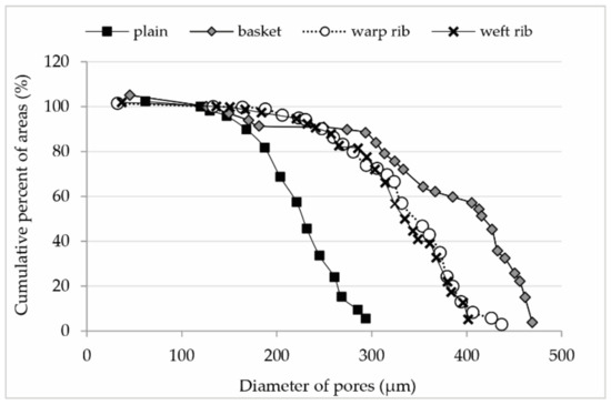 Cumulative percentage of pores in relation to the diameter of pores for all weaves.