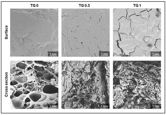 Figure 4 showed a visual representation of the surface and degree of crosslink of hydrogel under an electron microscope. As shown, the surface became rougher and the cross section showed denser linkage as TGase concentration increased.