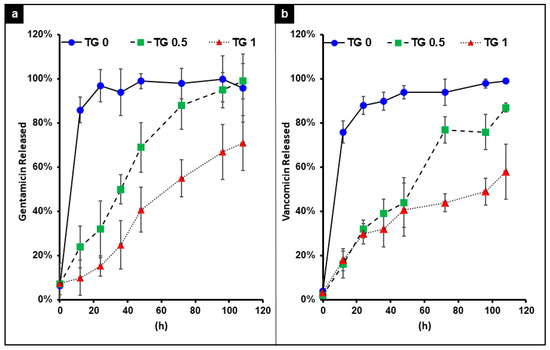 The release time of gentamicin (a) and vancomycin (b) encapsulated by hydrogel with 3 different concentrations of transglutaminase (TGase) added for crosslinking. With no TG the release of both drugs was near instantaneous. As the concentration of TG increases, a better slow release of the drug was achieved.