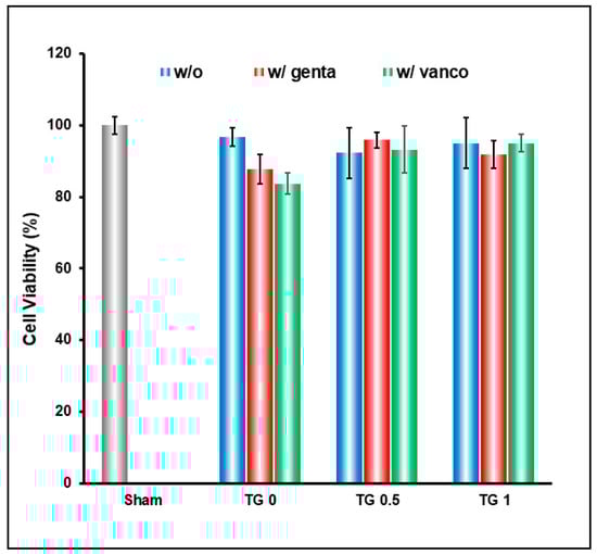 Cell viability result of hydrogel crosslinked with 3 different concentrations of transglutaminase (TGase), and encapsulating gentamicin and vancomycin. Without crosslink (TG0), the drug released was too rapid and resulted in slight decrease in cell viability; this is remedied by crosslinking the hydrogel to achieve slow release of drugs.