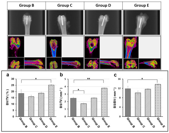 Radiographic, micro-CT (computed tomography) examination and bone volume change (a: Bone volume density = BV/TV; b: Bone surface density in total volume = BS/TV; c: Bone surface density = BS/BV) at the end of experiment (12 week). The X-ray images (upper row) and micro-CT scans (middle row) showing the radiographic evaluation for degree of osteomyelitis of each experimental group at the end of experiment (12 week). The peri-implant osteomyelitis-induced bone loss is significantly lower in the TGase cross-linked gelatin/alginate/vancomycin hydrogel group. Group B: titanium implant only; Group C: titanium implant with hydrogel; Group D: titanium implant with hydrogel and Gentamicin; Group E: titanium implant with Vancomycin. All implants were loaded with 108 CFU/5 mL Staphylococcus aureus to promote infection. (BV: Bone Volume, TV: Total Volume, BS: Bone Surface; *: p < 0.05; **: p < 0.01)