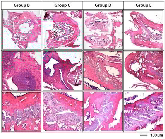 Histological examination of different treatment modalities for osteomyelitis rats after 12 weeks’ infection. After inoculation of Staphylococcus aureus, tissue necrosis with active inflammation and even biofilm formation was clearly demonstrated in all groups; while, the biofilm formation was found both the at the surface of the inserted pin and the inner surface of bony trabeculae. Group B: titanium implant only; Group C: titanium implant with hydrogel; Group D: titanium implant with hydrogel and gentamicin; Group E: titanium implant with vancomycin. All implants were loaded with 108 CFU/5 mL Staphylococcus aureus to promote infection.