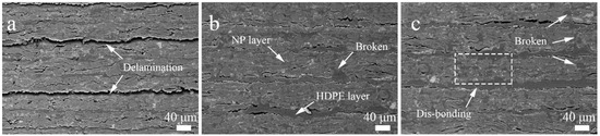 The microstructures of unmodified and SA modified composite samples are presented in Figure 2. The multilayer structure of composite samples was obvious that NP sheets and HDPE films were stacked alternately. It was found that HDPE permeated into the NP sheets and occupied the voids, forming a dense composite structure. However, pores and voids could be found clearly because of lacking enough HDPE (only 21.5% HDPE content of the composite) to fully fill. In comparison to unmodified composite samples, the modified composite samples showed intact cross section (Figure 2b,c). It was considered that adding SA could improve the interface bonding between NP fiber and HDPE. Therefore, there was no clear delamination and transverse cracks in modified composite. Since the penetration of HDPE was promoted, the fiber network was broken in modified composite and even dis-bonding in composite modified with high SA concentration (Figure 2c).