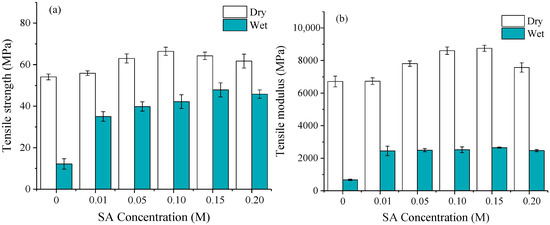 Figure 7. The effect of SA concentration on (a) tensile strength and (b) tensile modulus of modified NP in dry and wet conditions.