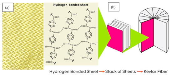 Kevlar fibers are high modulus fibers with applications in polymers reinforcements, as shown in Figure 1a, and based on poly (p-phenylene terephtalamide). Fibers are produced in a solution extruder where fiber strength can be controlled. The phenyl groups of the terephthalic segment and p-phenylene segment make angles of −30° and 38° with respect to the chain backbone. Two different models have been proposed for the supermolecular structure of Kevlar fibers. The first model proposes that the molecule’s hydrogen bond together to form sheet along the (100) crystal plane, as shown in Figure 1b. These sheets then stack around the fiber axis with (010) crystal direction pointing radially outward. The second model proposes that the fiber structure is composed of cylindrical surfaces sequentially arranged coaxially [24].