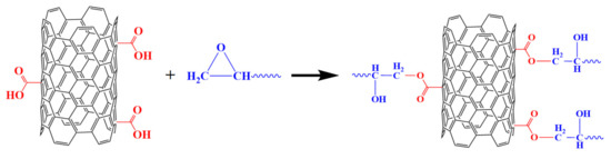 In functionalized MWCNTs, carboxyl groups serve as proton donors in the epoxide ring opening reaction, leading to enhanced polymerization near the surface of nanotubes and increased interfacial bonding, as shown in Figure 2.