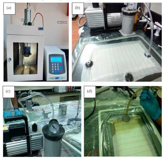 Synthesis and fabrication of Kevlar/epoxy/MWCNTs nanocomposite: (a) mixing epoxy/MWCNTs using sonication technique, (b) VIP tools, (c) evacuation process, and (d) fiber impregnation by the epoxy/MWCNTs mixture.