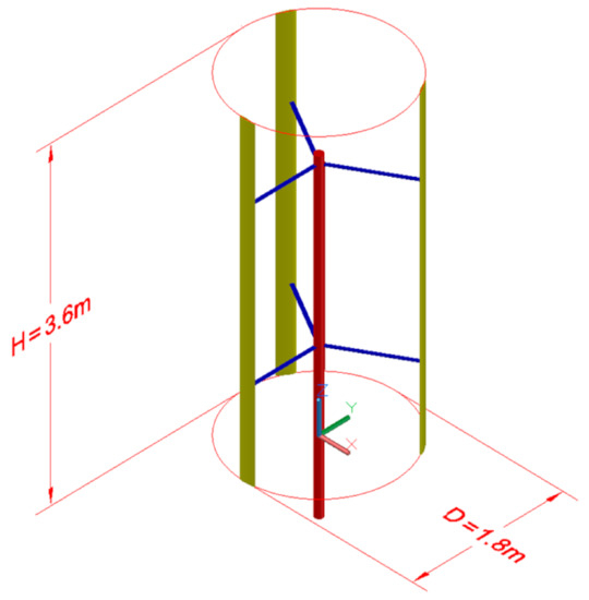 The geometry of the modeled VAWT includes the shaft, three blades, and six supporting struts. The geometry was created in Autodesk’s AutoCAD software (California United States) based on the information provided in Reference [24]. The shape of the VAWT geometry is illustrated in Figure 4.