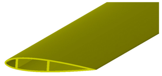 The VAWT geometry and its operating conditions were selected based on an optimization study. The optimized VAWT was a three-bladed VAWT with a 1.8 m diameter. Each blade followed the NACA20015 airfoil profile and had a span of 3.6 m. This gave an aspect ratio of two based on the ratio between the turbine height and diameter. At the optimal conditions, the turbine rotated at 20.222 rad/s when the wind speed was 7 m/s. The main parameters of the optimized turbine are presented in Table 5. Figure 4 illustrates the 3D geometry and the main dimensions of the optimized VAWT. Figure 5 shows the shape of the blade cross section, which includes two shear webs.