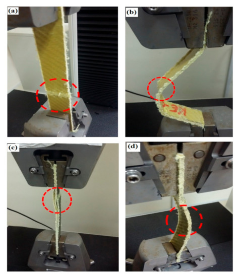 Mechanical testing: (a) Kevlar-reinforced epoxy under tension, (b) Kevlar-reinforced epoxy under compression, (c) Kevlar/epoxy MWCNTs (0.5 wt.%), and (d) Kevlar/epoxy F-MWCNTs.