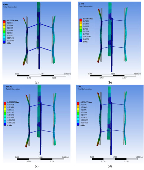 Based on the method discussed in Section 2, the FEA structure analysis of an optimized VAWT was performed. Figure 11 shows a graphical representation of the deformation of the turbine blades with KR0, KR1, KR2, KR3, and KR4 material at the optimal TSR of 2.6. It is observed that the maximum deflections occur on the blade tips. In addition, high defections are observed at the blade midspan. Several tests were carried out in order to study the effects of implementing different materials on the maximum deflections at different centrifugal loads. Figure 12 shows the maximum deflection of the blades at different TSRs for different KR-type materials. KR2 showed the maximum deflection (0.054 m) at TSR 3.1. High deflection of KR2 can be attributed to the agglomeration of unmodified MWCNTs at high loading (0.5 wt.%). Deflection study using ANSYS is in good agreement with the surface morphology and mechanical testing results.