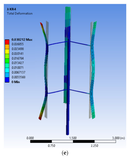 Graphical representation of the deformation of the turbine blades with (a) KR0, (b) KR1, (c) KR2, (d) KR 3, and (e) KR 4 material, at the optimal TSR of 2.6.