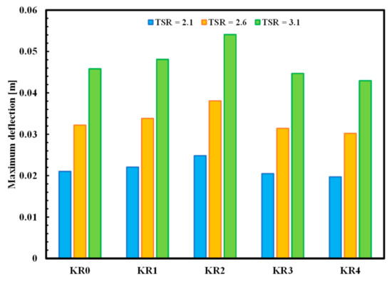 The maximum deflection of the blades at different TSRs for different KR-type materials.