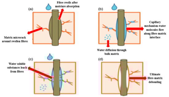 Effect of water absorption of natural fiber on mechanical properties of composite laminate:(a) fibre swells after moisture absorption,(b) capillary mechanism water molecules flow along fibre-matrix interface, (c) water soluble substance leach from fibres, and (d) ultimate fibre-debonding [43].