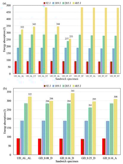 Chen et al. [63] investigated several advanced foam-filled multi-cell composite panels (FMCPs) made from glass fiber-reinforced polymer (GFRP) skins, GFRP lattice webs, and polyurethane (PU), under quasi-static compression. This study investigated four parameters: the effects of the skin and lattice-web thickness, the foam-cell width and height, and the foam density. The analysis showed great reductions in the peak crushing force and bearing loads for the FMCP with trapezoidal cells. Importantly, the FMCP with double-layer dislocation cells exhibited a specific energy absorption capacity and the highest mean crushing load. A study on the response of sandwich panels made of uniform (UD) and several graded density (GD) foam cores and skins produced from aluminum (AL), stainless steel (ST), and carbon fiber (CF) was conducted by Sun et al. [64]. The UD and CF were noted as having the highest specific energy absorption in comparison with the other panels, while specimens produced with GD_0.16_D were recorded as having the highest energy absorption when compared with the other panels, with less than 485 J impact, as shown in Figure 3.